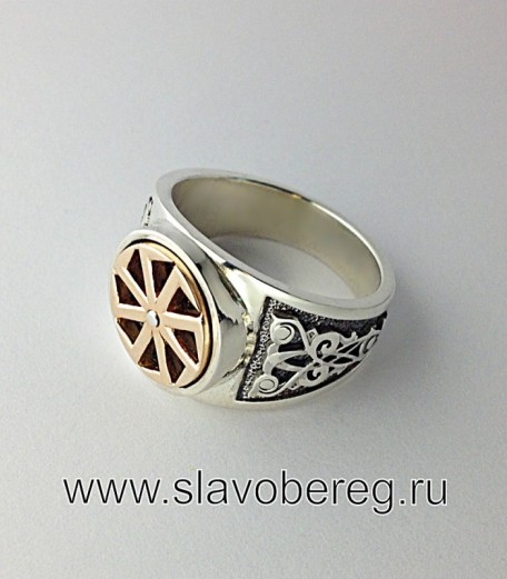 Перстень выполнен из серебра 925 пробы. Символ Коловрат вращается, выполнен из золота 585 пробы. Символ весит 1 грамм золота. Перстень вес до 15 гр, размер можем выполнить любой.